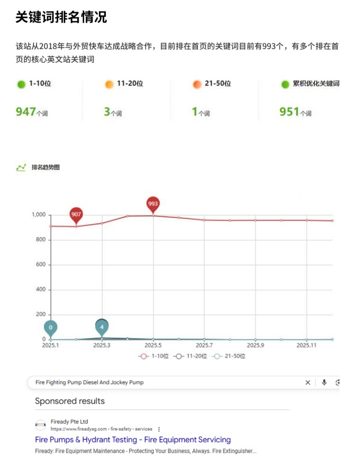 深圳思亿欧深耕谷歌网站SEO搜索引擎优化领域,以专业技术为核心竞争力,专注为外贸企业搭建高效海外获客通道,助力中国制造业扬帆出海。本次合作的伙伴,是一家深耕泵与电机制造领域十余年的国家高新技术企业,拥有自有专业泵厂,技术沉淀深厚。企业规模完备,现有200多名员工,涵盖工程师、技术人员、售后专家及销售人员,形成了从研发、生产到销售、售后的全链条服务体系,全方位保障客户需求落地。其主营离心泵、消防泵及系统、工业泵、家用泵等多品类产品,可定制各类消防泵组,产品远销60多个国家和地区,坚实的企业实力为双方谷歌自然排名优化合作奠定了稳固基础。2018年,该企业与思亿欧旗下外贸快车达成战略合作,以谷歌搜索引擎优化为抓手,正式开启海外市场深耕之路。