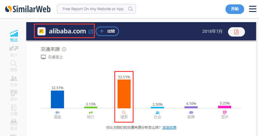 我们再来看阿里巴巴国际站的流量来源(来自alexa.com)